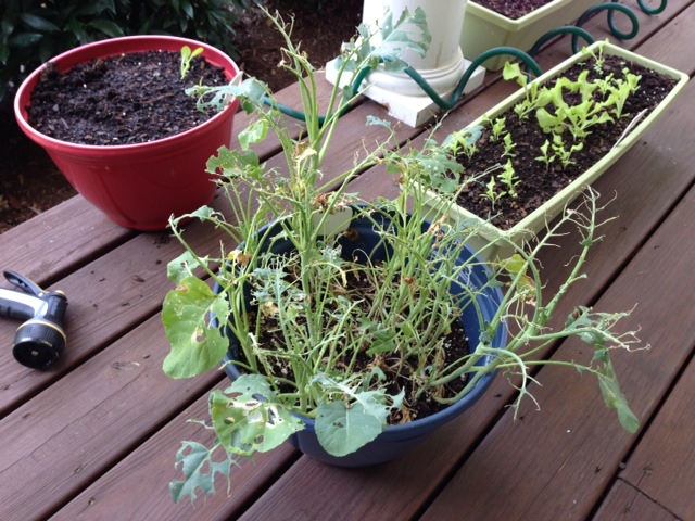 The horror…stupid cabbage worms and yet another species of worm defoliated my broccoli in a day. I bought some Ortho spray (forget the name), but it didn’t seem to slow them down at all. Oh well, guess it’s part of the learning process. I have to see what kills the damn bugs, that and plant earlier.