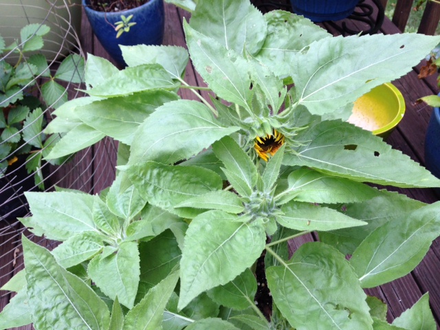 YAY!! A Sunflower is peeking out! This is part of 20 plants jammed in two planter boxes, the seem to like it OK but don’t get nearly as tall as the ones in the dirt. Which is good, since they’d topple over. I have high hopes for these, assuming I can keep the 4 legged pests at bay.