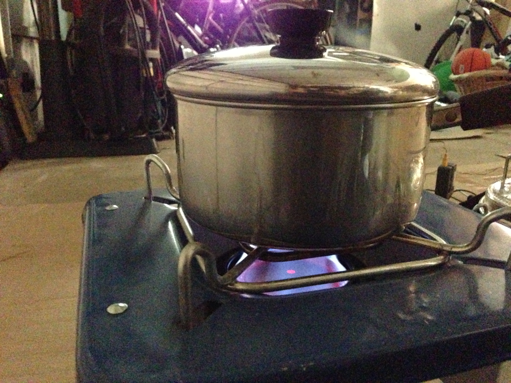 burnerThis is a Harbor Freight single propane burner, it’s the shizz. Nicely made, perfect flame etc. I used this one long ago to make coffee, but on a 12 oz bottle versus the 15 lb cylinder. The hose to the right I got at Home Depot, it has a regulator with the gas flare fitting. Gotta have that…